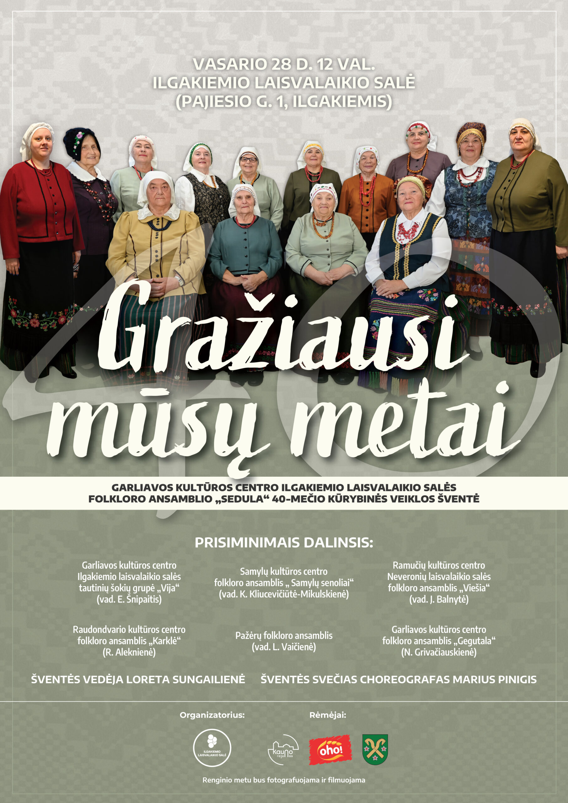 Garliavos kultūros centro Ilgakiemio laisvalaikio salės folkloro ansamblis „Sedula“ kviečia į jubiliejinę šventę „Gražiausi mūsų metai“, skirtą paminėti ansamblio 40-mečio kūrybinės veiklos sukaktį.